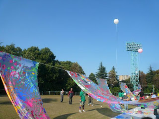 野球場の中に大きなシートを引いてみんなでいろんな色のペンキで