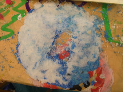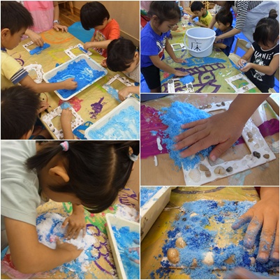 絵具は3色。青・水色・白です。塩に絵具を混ぜて手でスリスリ擦って